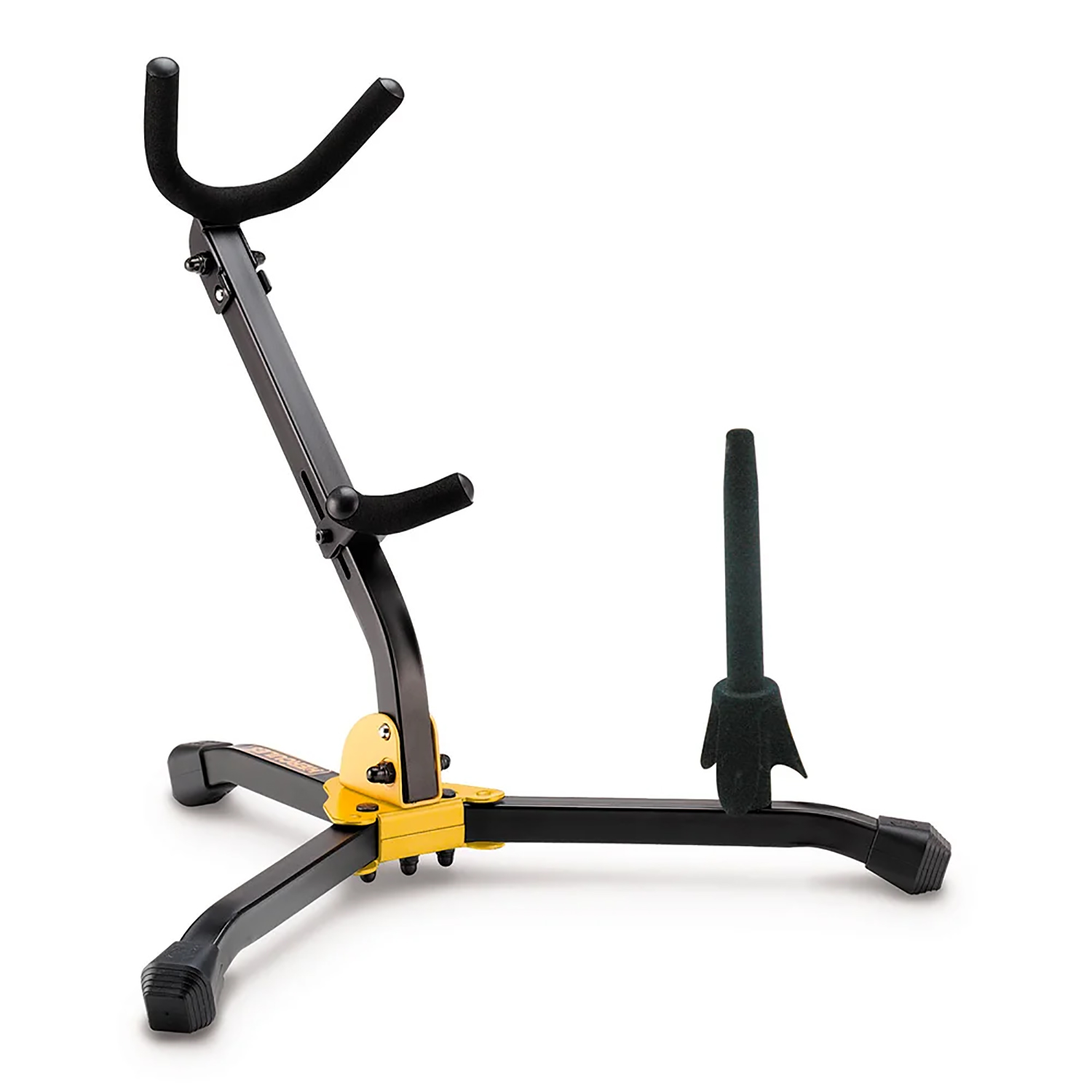O DS532BB é um suporte multifuncional que aceita 2 instrumentos, sendo um para Sax Alto ou Tenor com garfo dobrável, encosto ajustável e pinos de travamento que acomodam o instrumento com segurança e um pino adicional para flauta ou clarinete.