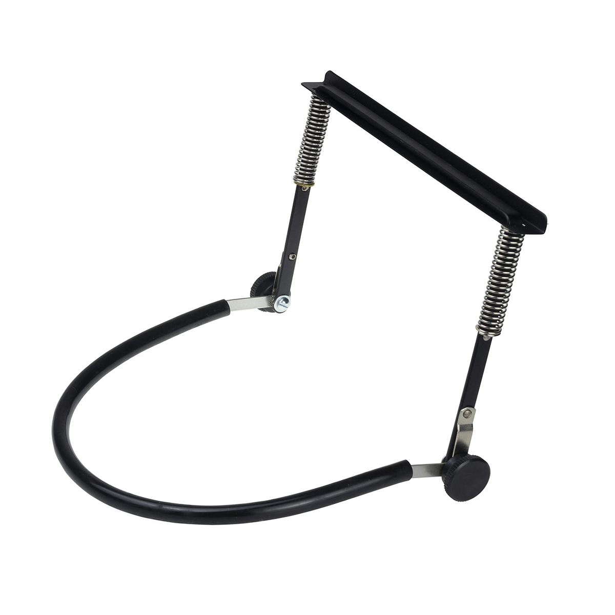 Suporte fabricado totalmente em metal com partes com acabamento na cor preto, possui molas travas evitando que a gaita escorregue ou venha a cair do suporte. Possui travas / aperto através de 02 peças revestidas com plástico ABS, facilitando a regulagem e/ou ajustes de angulo para melhor encaixe no pescoço ou postura, deixando a gaita bem próxima da boca, facilitando a execução do instrumento.